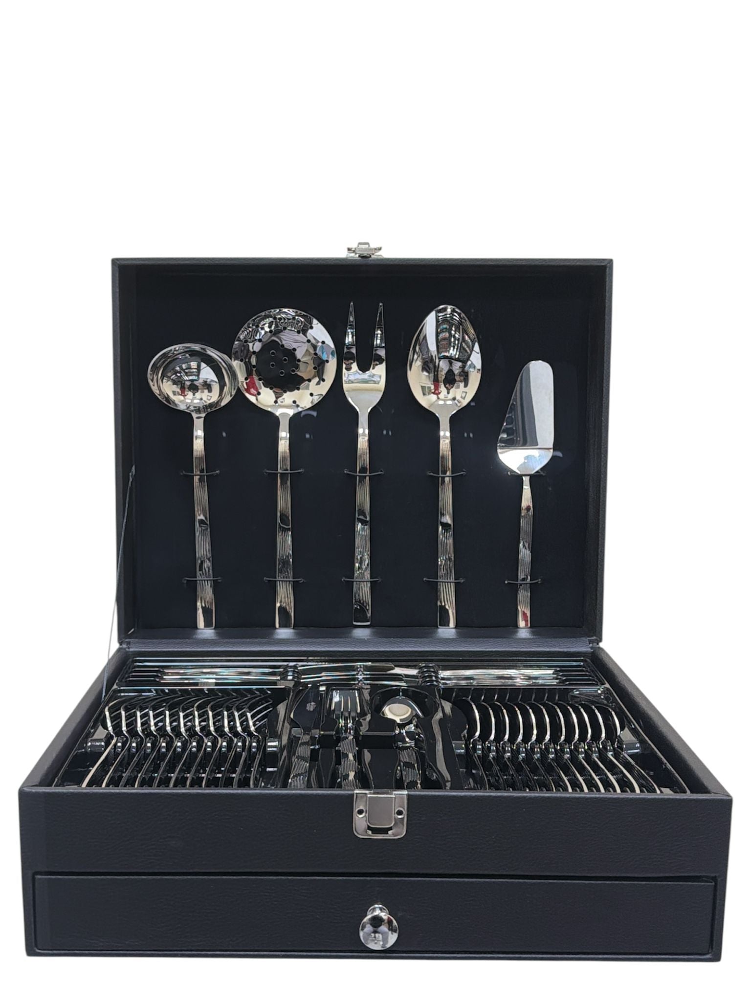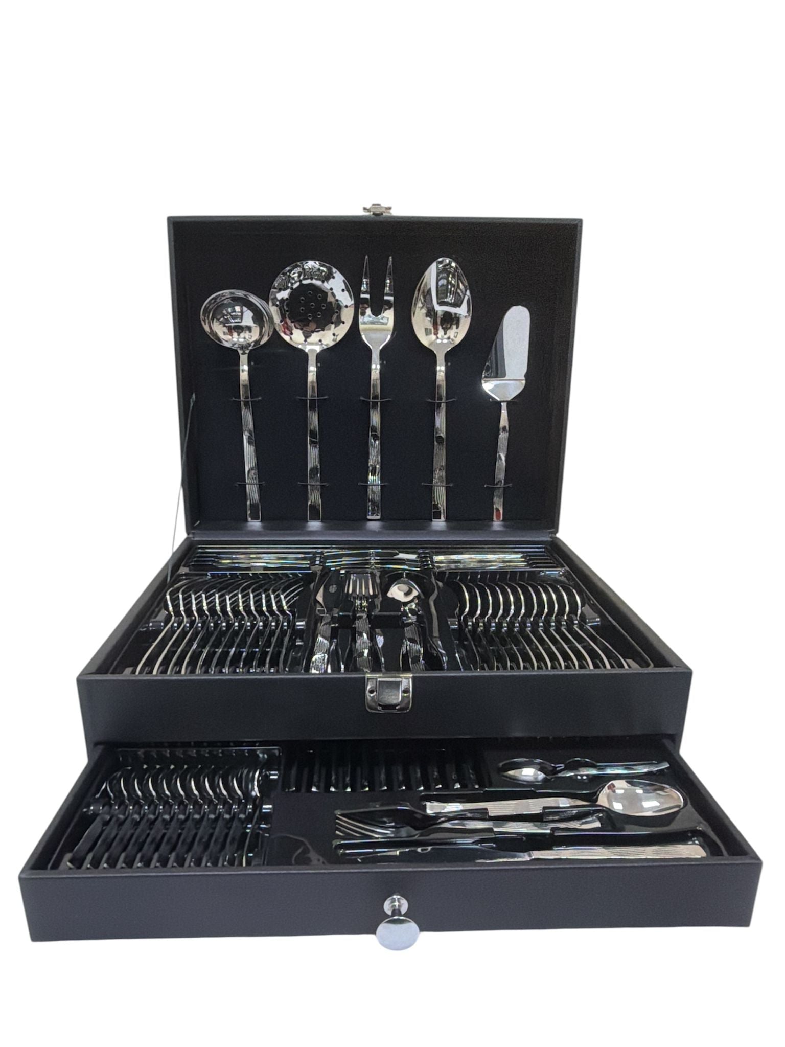 Our 90 Pcs Stainless Steel Cutlery Set comes in a refined leather luxury box—crafted for those who value timeless quality and sophisticated design.
